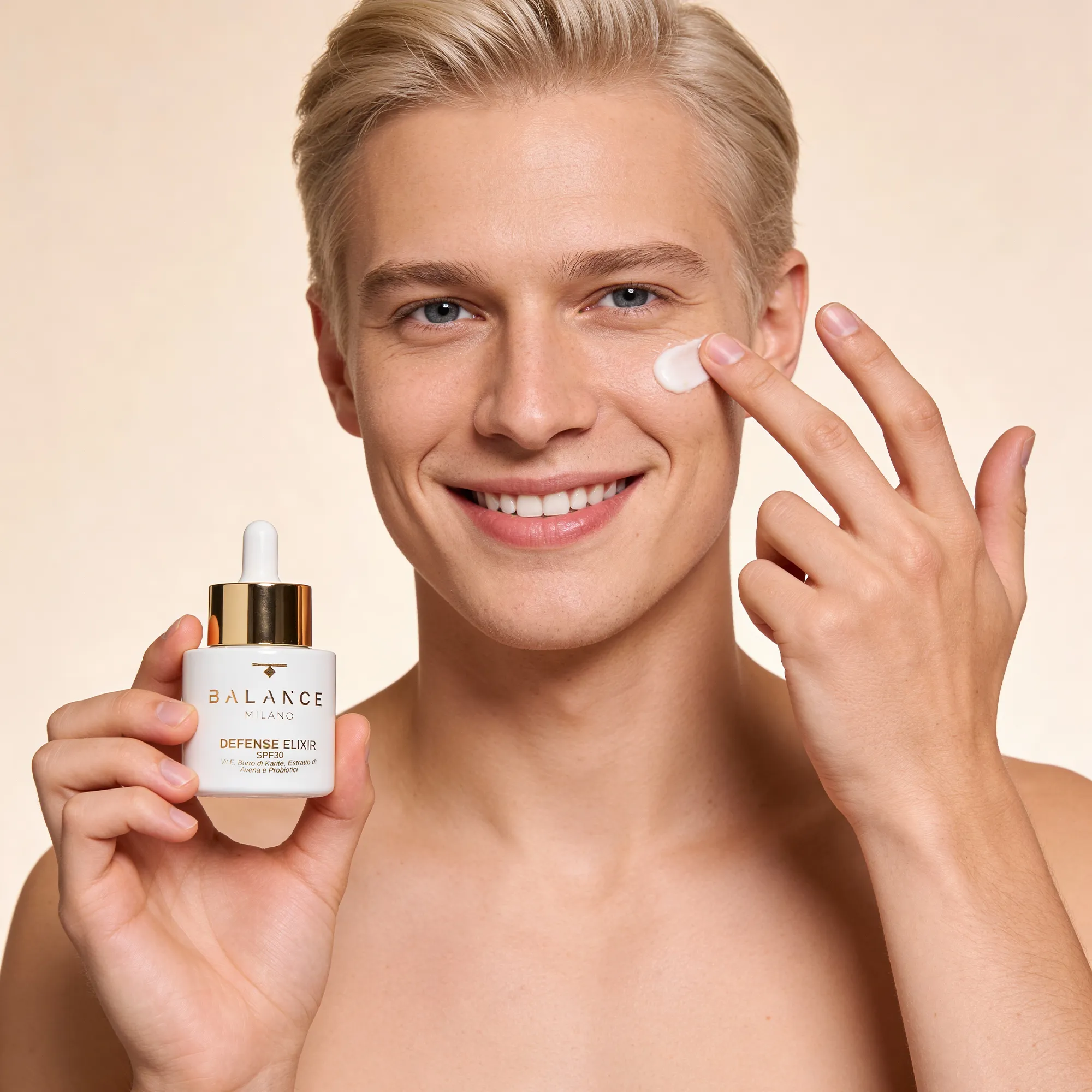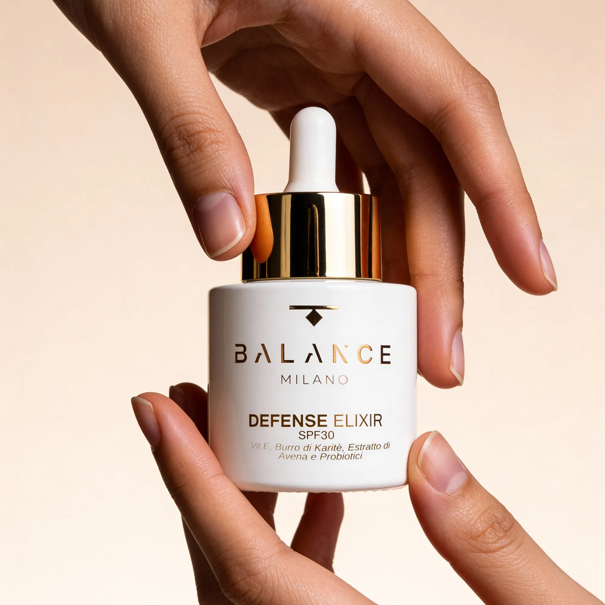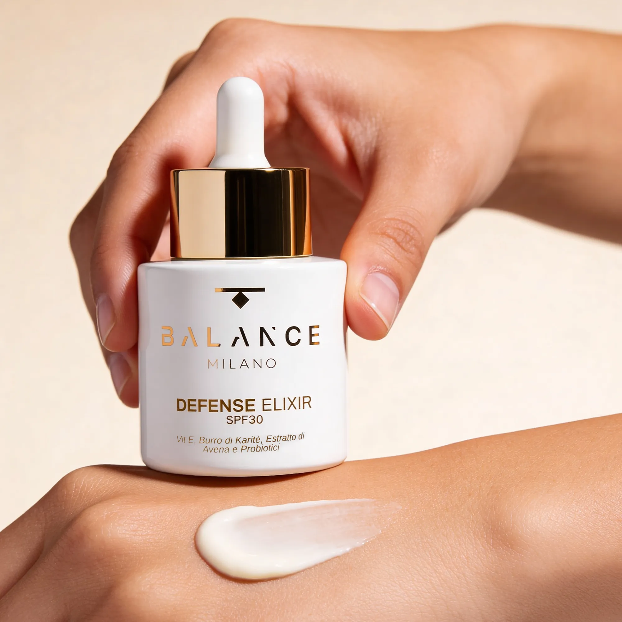 Defense Elixir SPF30 di Balance Milano è un siero crema viso leggero ad assorbimento rapido formulato per proteggere quotidianamente la pelle e rafforzarne la barriera naturale.