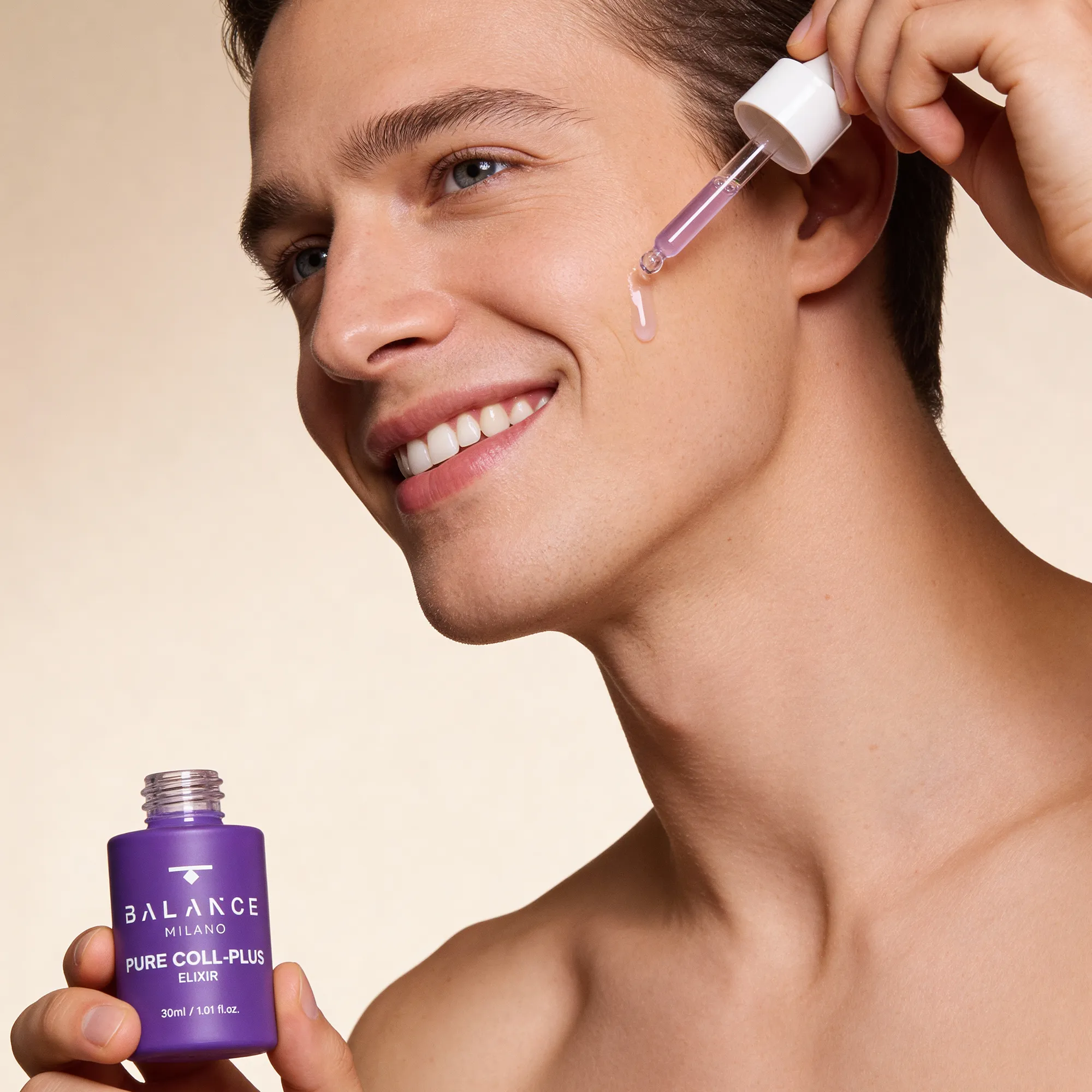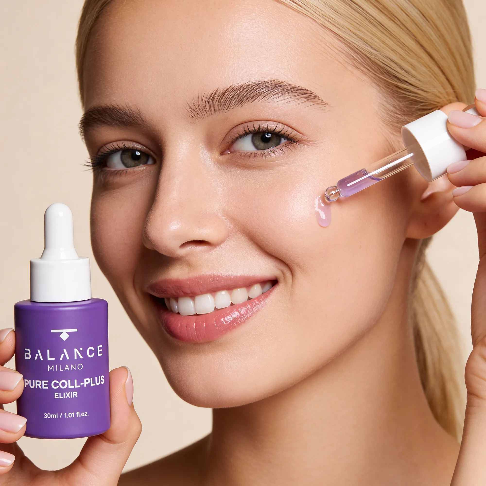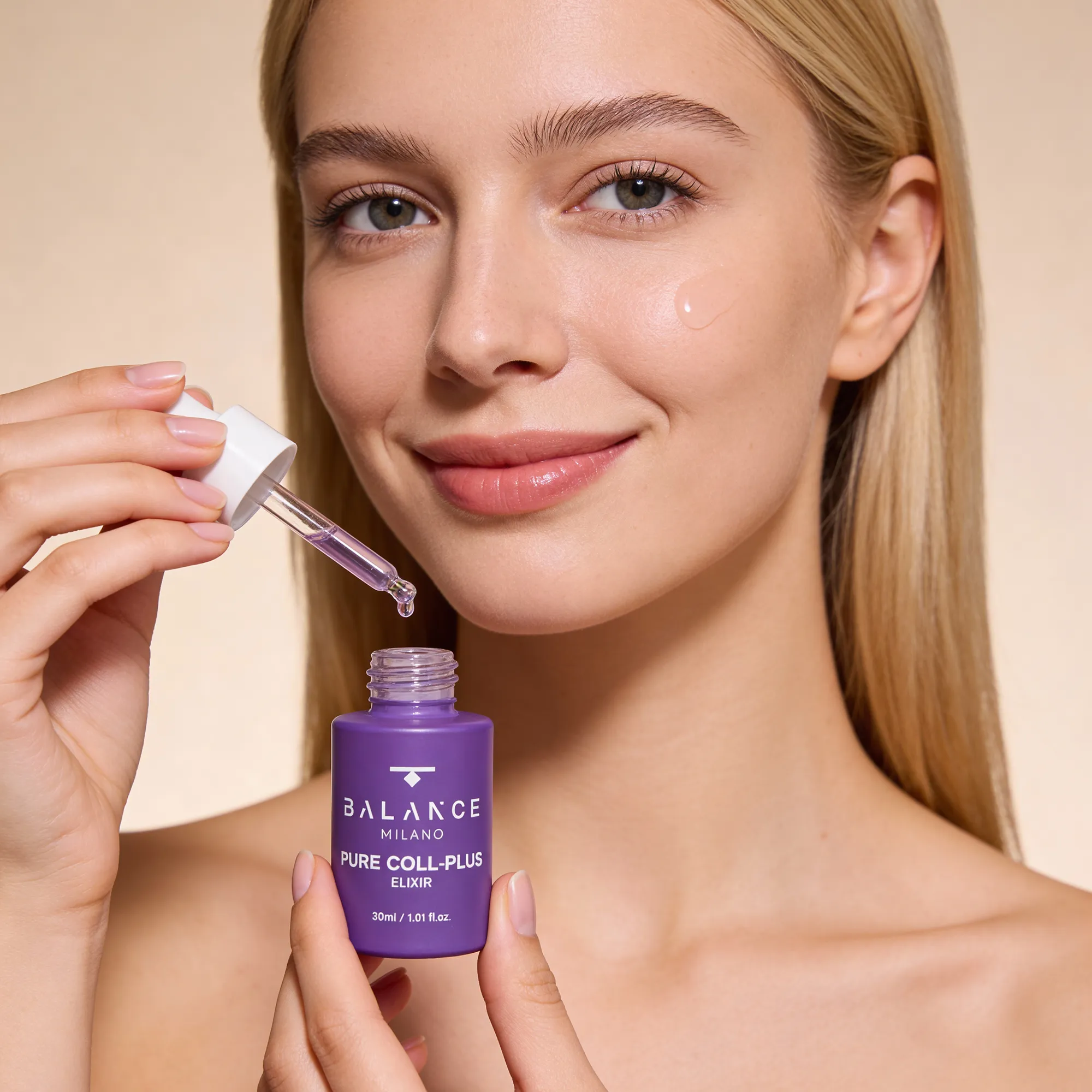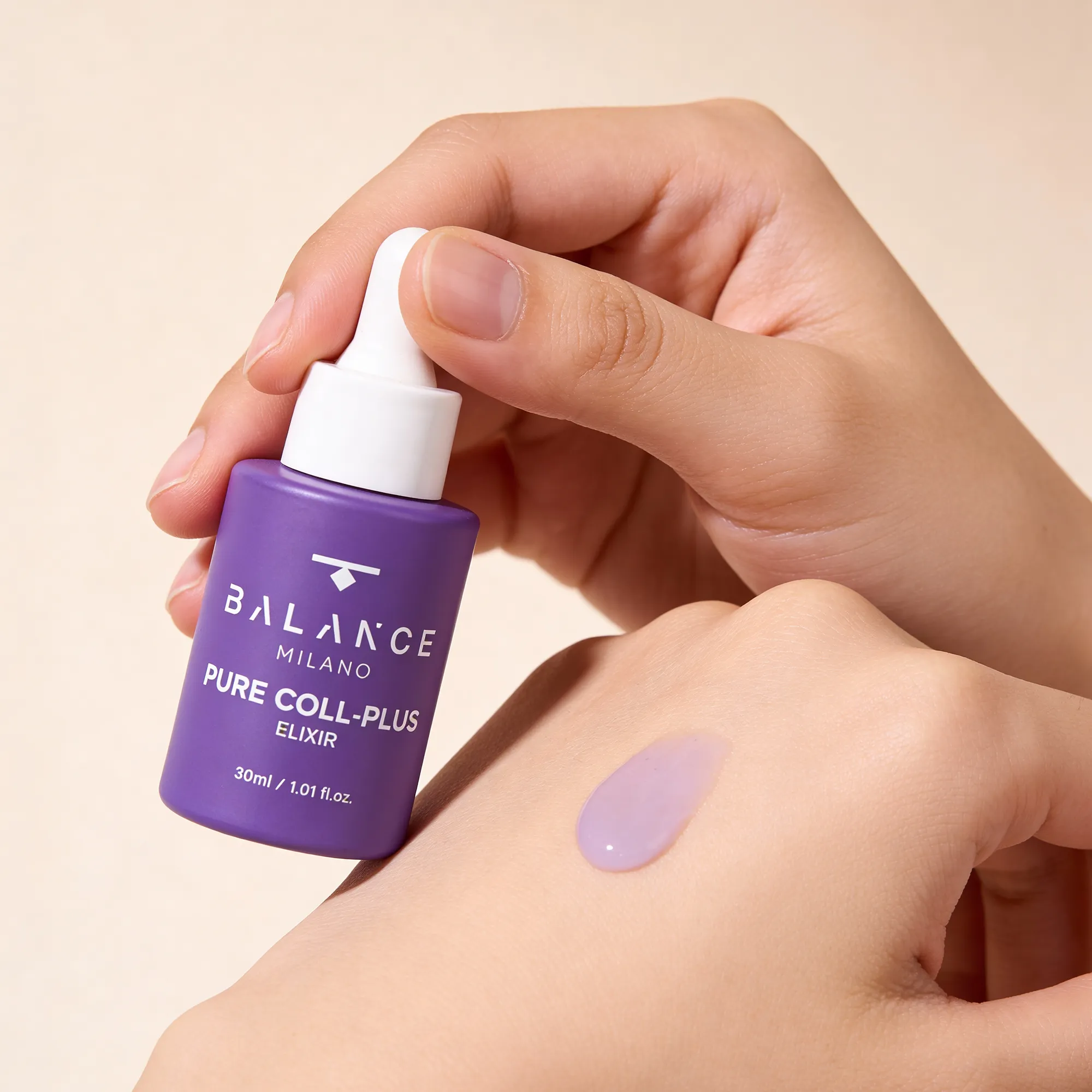PURE COLL-PLUS ELIXIR di Balance Milano è un siero gel leggero ad azione rimpolpante, levigante e tonificante, formulato per migliorare visibilmente compattezza, elasticità e luminosità della pelle.